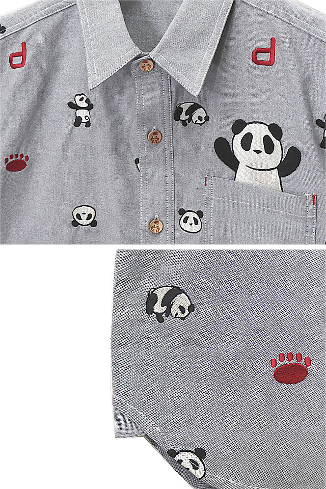 フロントの胸ポケットから顔を覗かせるパンダはいつもより大き目に刺繍させていただきました。