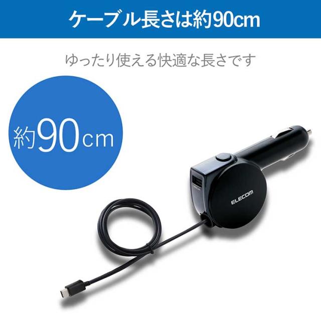 エレコム シガーチャージャー Type-C リールタイプ USBポート付 おまかせ充電 90cm 5.4A ブラック