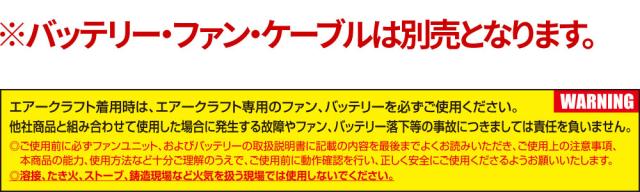 ・ご使用前に必ずファンユニット、およびバッテリーの取扱説明書に記載の内容を最後までよくお読みいただき、ご使用上の注意事項、本商品の能力、使用方法などを十分ご理解の上で、ご使用前に動作確認を行い、正しく安全にご使用下さるようお願い致します。