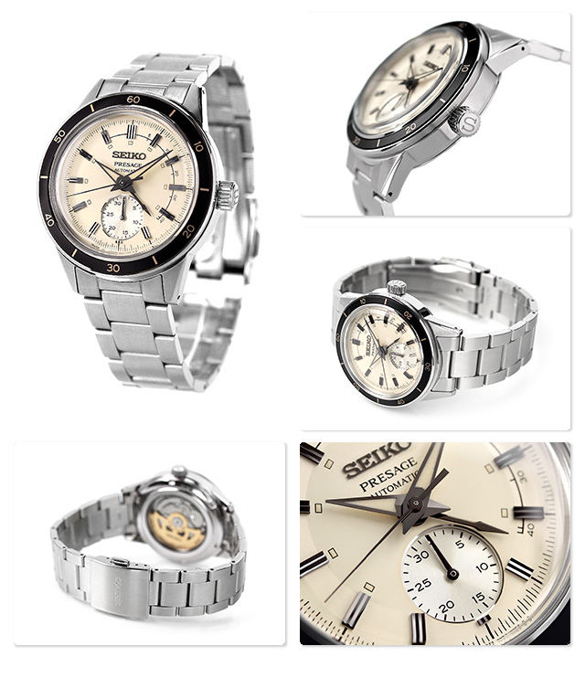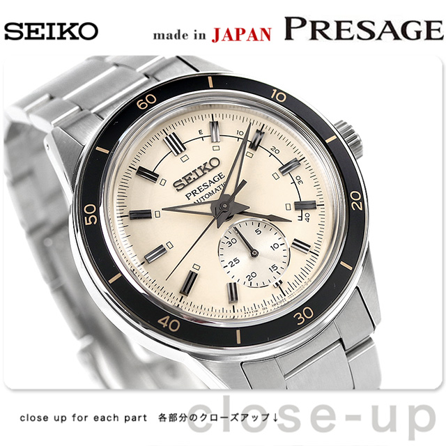 正規品 7年保証キャンペーン 送料無料 セイコー メカニカル プレザージュ ベーシックライン 日本製 自動巻き メンズ 腕時計 SARY209 SEIKO Mechanical PRESAGE Basic line Style60's アナログ アイボリー ◆Style60's初採用となるCal.4R5を採用。サブダイヤルを6時位置に配置することで、ビンテージウオッチ特有のスタイルを実現。ベースのダイヤルとサブダイヤルで違った色を組み合わせることで、表情の幅も拡大しビンテージの雰囲気をさらに増しました。パワーリザーブインジケーターの太く特徴的な針もアクセントになっています。また、アースカラーを使用することで、ビンテージ感を一層高めながらも、幅広いファッションと組み合わせて愉しむことが可能に。ジャケットを合わせたキレイ目スタイルから、古着のジーンズやスウェットシャツを合わせたカジュアルスタイルなど、どんなスタイルにも適したモデルです。発売日:2022年06月発売機械式腕時計