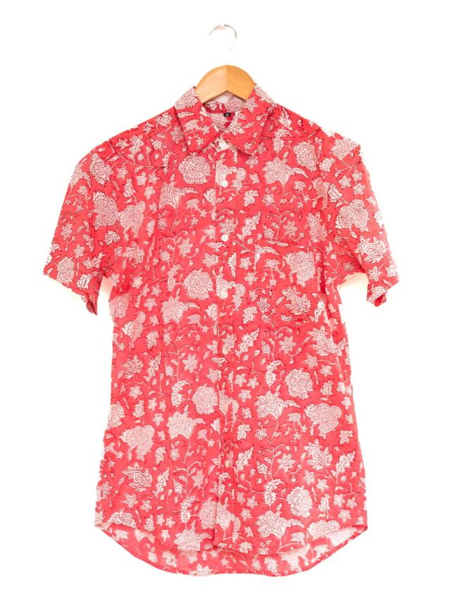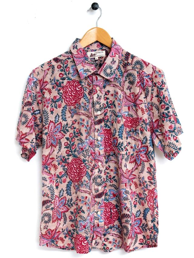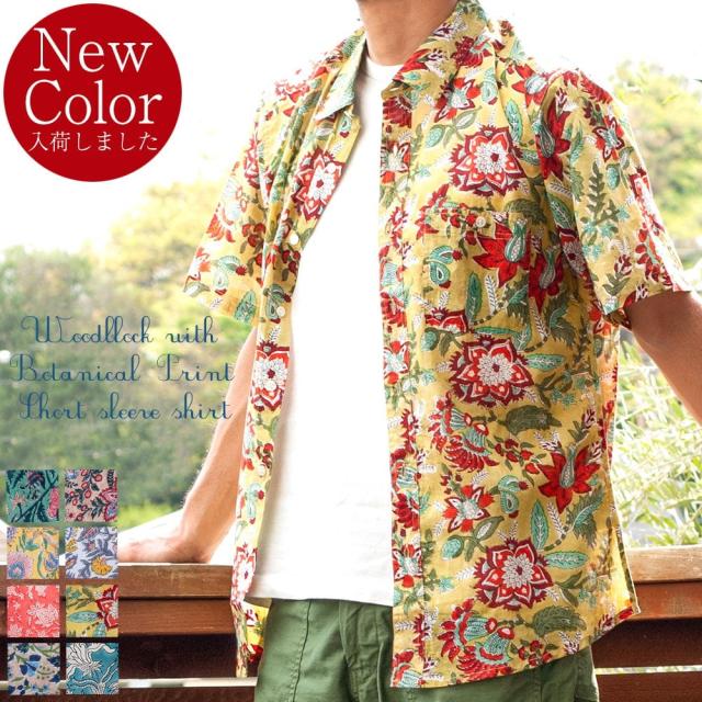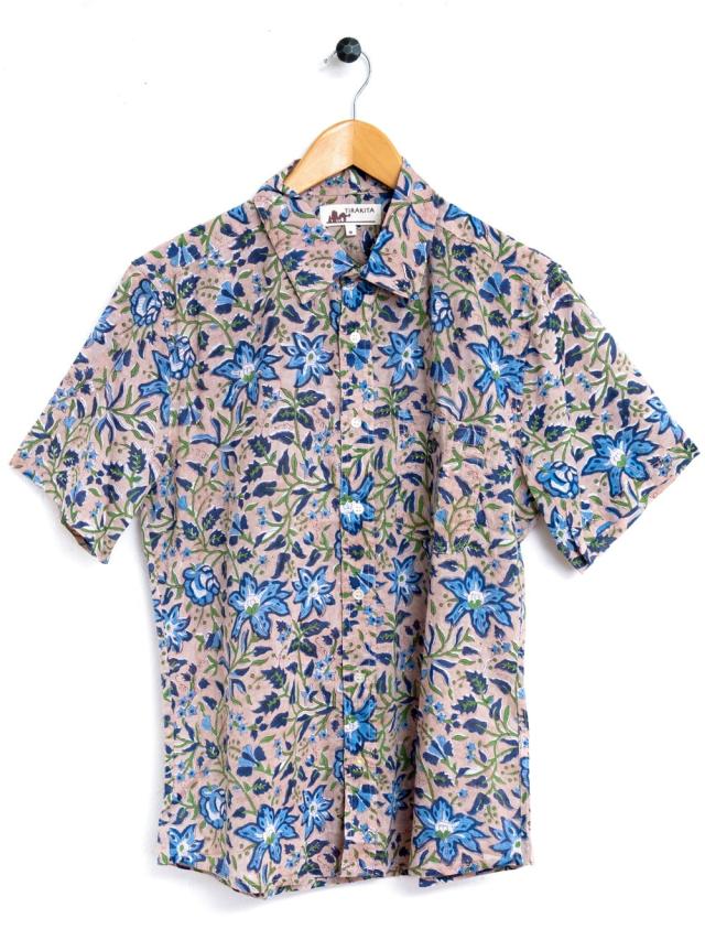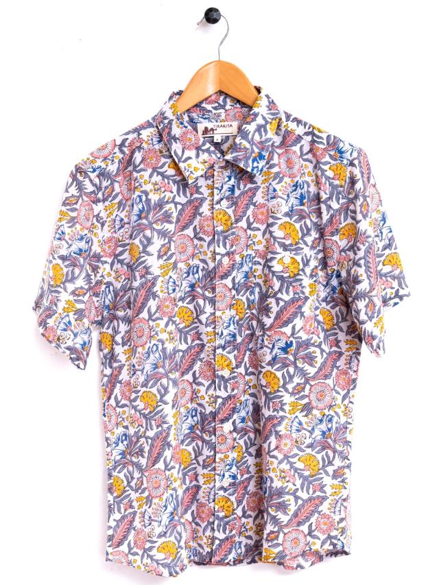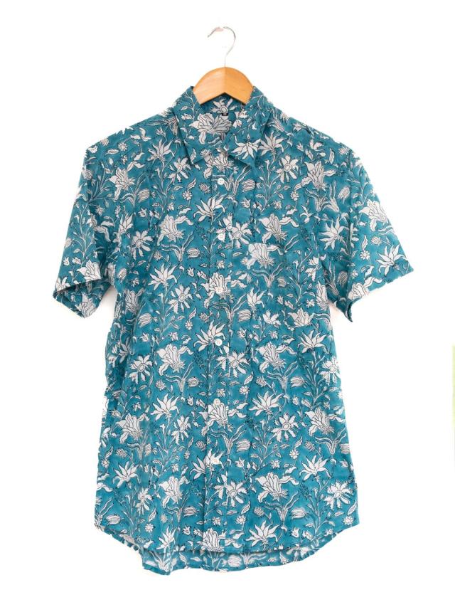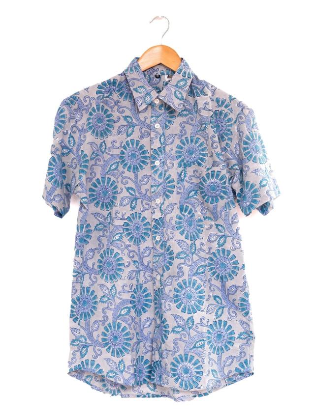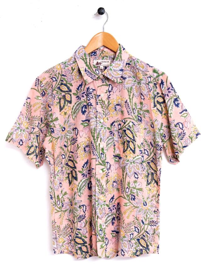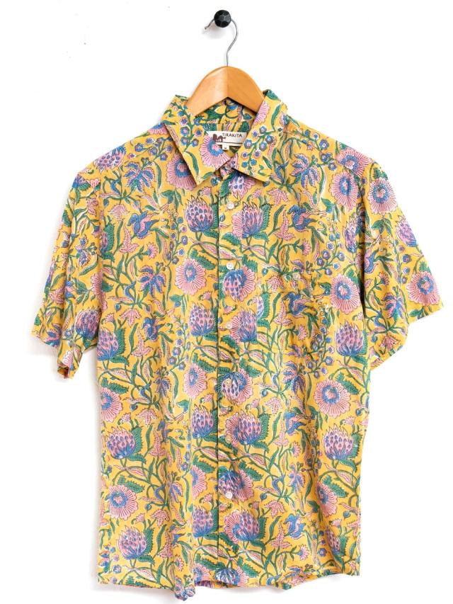ボタニカル柄の木版染めが美しい 半袖コットンシャツ / アロハシャツ、半袖シャツ、メンズ、メンズシャツ、インド、木版染め、ウッドブロック、春,夏,秋,コットンシャツ,羽織物,ユニセックス,男女兼用 TIRAKITA(ティラキタ) エスニック衣料 【エスニック・アジアン衣料