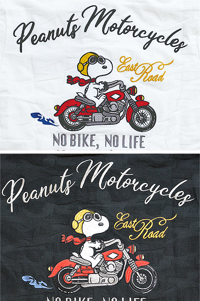 背中には愛車のバイクで疾走するスヌーピーが描かれています。