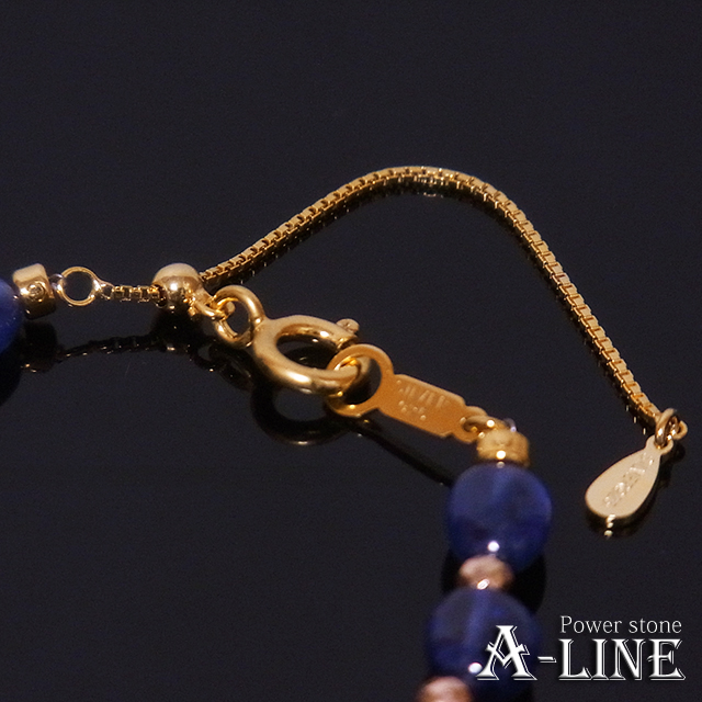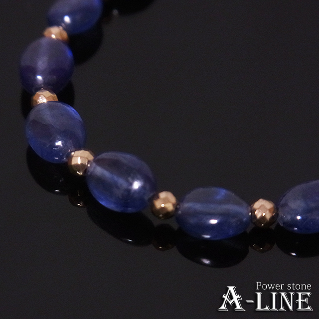 タンブル型ブルーサファイア(含侵)約8mm、ヘマタイト・ファセット(コーティング)金色、SILVER925ひき輪&スライドアジャスター金色、形状記憶超弾性ワイヤー、ワンプッシュ