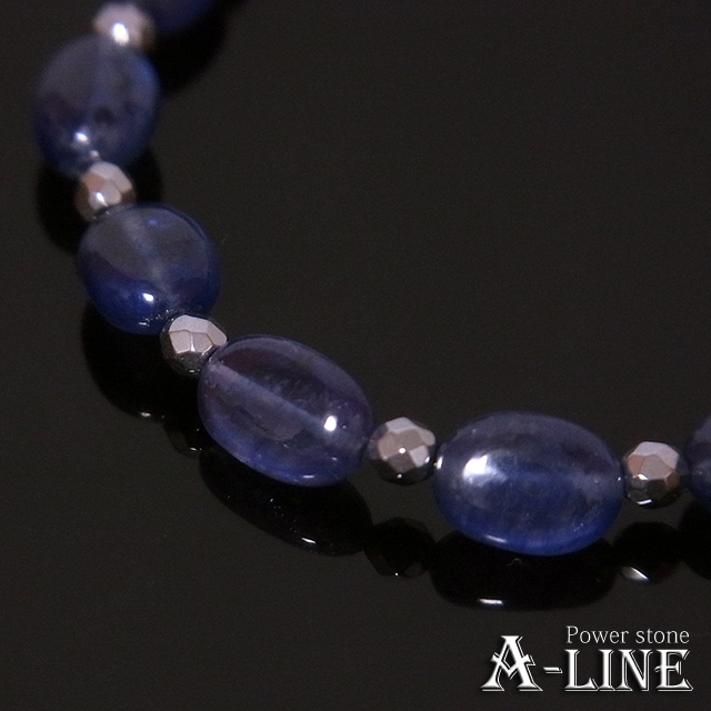 タンブル型ブルーサファイア(含侵)約8mm、ヘマタイト・ファセット(コーティング)銀色、SILVER925ひき輪&スライドアジャスター銀色、形状記憶超弾性ワイヤー、ワンプッシュ