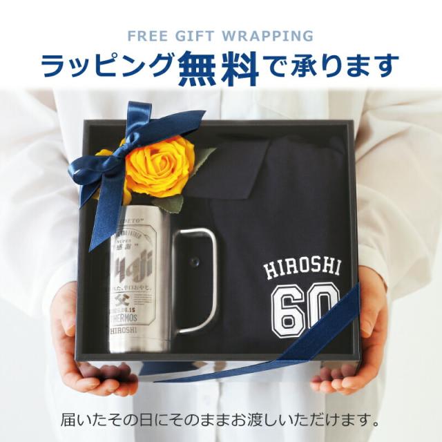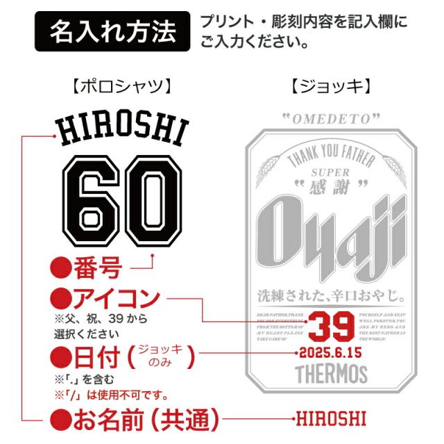 当店人気2商品がまさかのコラボタッグ! マジで使えるジョッキ&タンブラーは機能性抜群! 父の日ギフトに絶対おすすめです! 【 サーモス Oyajiジョッキ 】 1) 安心・信頼のサーモスブランド - 機能性 - キンキンに冷えたビールを楽しみたいなら、 機能性にも注目しておきたいところ。 サーモスといえば、魔法びん のパイオニア! 真空断熱構造で造られたタンブラーは、熱伝導が発生しにくく、温かいまま・冷たいままを長時間維持します。 美味しい温度をキープできるから、アウトドアにも重宝する ステンレスタンブラー です。 氷が溶けにくい、結露しにくい ので、 テーブルを濡らすことなく、ストレスフリーで晩酌を楽しむことが出来ます。 食洗機対応 なのでお手入れも簡単! その使い勝手の良さを知ったら、もう他のグラスには戻れなくなるはず。 - 容量 - コンパクトなサイズに見えて、その容量は600ml! 500ml の缶ビールが、つぎ足しいらずで一本分注げるサイズです。 ノンストップでのど越しを楽しめて、爽快な気分にしてくれます。 氷を入れてもたくさん飲めるので、ハイボールや酎ハイグラスとしてもお使いいただけます。 ハンドル付きだから持ちやすく、片手でぐいぐい飲むことだって出来ちゃいます。 とにかくドリンクの冷たさにこだわりたい方にはもちろん、ビールを飲むならやっぱりジョッキで豪快にいきたい!という方にはこの ジョッキタンブラー がおすすめです。 2)当店オリジナル!父に捧げるOyajiデザイン ビール好き なら誰もが知ってるこのデザイン。 かと思いきや、よくよく見ると真ん中に大きく刻まれた文字は “Oyaji” 親しみこもったこの愛称は、まさに子から父への贈り物。 思わず笑いがこみ上げてしまう、ユニークなデザインに仕上げました。 そのインパクトの大きさと、気が付いた瞬間の驚きと感動はきっと忘れられないものになるはず! リモート飲みでも画面映えするから、みんなの視線を釘付けに。仲間内でも話題になりますよ。 さりげなくデザインに馴染んだ「感謝」「THANK YOU FATHER」のメッセージは ユーモアを交えて感謝の気持ちを伝えることが出来るから、 直接言葉にするのが照れくさい人はこの ビールジョッキ を贈るのがおすすめ。 贈った側も贈られた側もこころ温まる サプライズギフトになるでしょう。 ーーーーーーーーーーーーーーーーーーーーーーーー 【 ナンバーポロシャツ 】 1) 機能性 - 吸水速乾 - 暑〜い季節の大敵といったら、汗。 運動の後、汗で不快な思いをすることも…。 フローレンなら吸水速乾機能を持つ生地だから、素早く汗を吸収拡散してくれるので汗をかいてもべたつかず、さらっとした着心地のまま過ごせます。 - 強力消臭 - 汗と同じくらい気になるのが匂い。 人に接近した時も、思わず気にしてしまいますよね。 だけど消臭機能のあるこのシャツなら大丈夫。 強力消臭糸・縫製糸を使用だから、臭いを中和・分解し消臭してくれます。 - UVカット - UVカット機能で人体に有害な紫外線をしっかり遮蔽。 散歩やお出かけにはもちろん、ゴルフ や テニス キャンプ など、野外で活動するときも、日差しから肌を守ってくれます。 汗を多くかく人には特におすすめ!夏場でもサラリと着こなせるから一緒にいる人に気を遣うことなく、常に ドライ な印象に! 2) 全6色カラー カラーは6色の中からお選びください ・ 一番人気のベーシックカラー ネイビー ・ 落ち着きのあるえんじ色 バーガンディ ・ クリーンなイメージで好印象 ホワイト ・ 若々しいお父さんにはこのカラー ピンク ・ 爽やかな夏色で グリーン ・ ゴルフ場にもよく映える情熱的な赤色 レッド 白 やピンク色などの明色から、紺 や エンジ などの暗色まで取り揃えていますので、相手のイメージにピッタリのカラーが見つかるはず! 相手の好きな色を贈っても良し! あえて普段着ない色を選んで ファッション の幅を広げたり気分を新しくしてみるのも◎ 3) サイズ サイズはS〜XLまで展開しております。 小柄な おじいちゃん ならSサイズ恰幅のいい お父さん にはXL。 体形に合ったサイズをお選びください。 ----- 当店スタッフが実際に試着してみました ----- 「実際に来ているところのイメージが浮かばない」 「サプライズで渡したいけれど相手のサイズがわからない…」 そんなお悩みを抱えているお客様の為に当店の男性スタッフたちが試着して、どのサイズが自分にベストか選んでもらいました。 サイズ選びでお困りの方は、参考にしてみてください。 【 名入れプリント 】 ジョッキ・ポロシャツにはそれぞれお名前・番号・日付(※ジョッキのみ)が入ります。 ジョッキはレーザー彫刻にてポロシャツはカッティングシートプリンターでお入れいたします。 「名入れギフト」は大切な人に感謝の気持ちを伝えるのにぴったりなおくりもの。 私たちは、贈られた人も贈った人もみんなが笑顔になれる商品をお届けします。 ≪こんなシーンにおすすめ≫ ・父 義父 祖父 への 父の日 敬老の日 