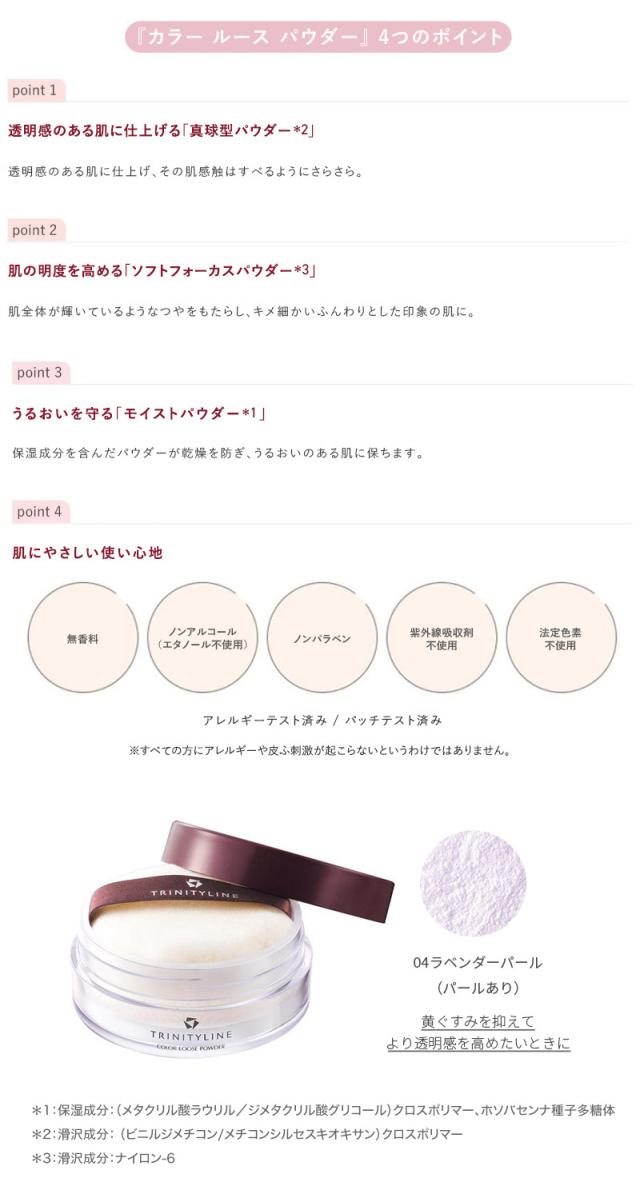 公式 大正製薬 トリニティーライン カラー ルース パウダー 04ラベンダー 17g フェイスパウダー ルースパウダー 化粧品 パール パフ クリア 透明感 崩れない パウダーケース 持ち運び 携帯用 コンパクト 艶 ツヤ肌 テカリ防止 化粧直し 艶肌 パール入り ブランド プレゼント