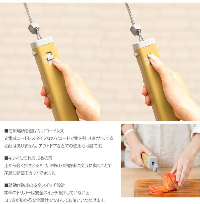 力加減が難しく崩れやすいお肉や野菜も上から軽く押さえるだけ。充電式なのでキッチンに限らず使用場所を選びません。