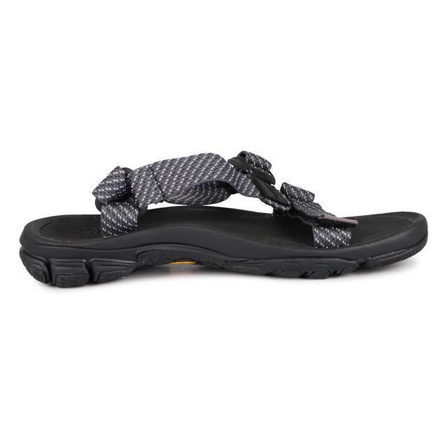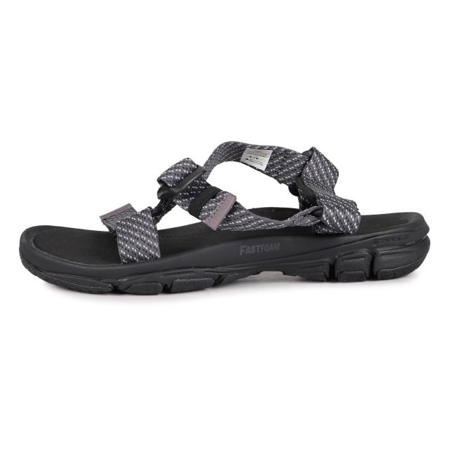 ミニマル(無駄を省いた構造)とモーション(操作)をコンセプトに、歩いたり走ったりする時に、足との高いフィット性を実現するストラップ構造を採用した高機能のサンダル「ULTRA STRATUM PRO」。ウェビングテープは100%リサイクル素材を採用し環境にも配慮。2カ所のストラップでフィット感の調節が可能で、簡単に脱ぎ履きすることができます。ボトムユニットには、反発力と安定性に優れるFASTFOAMテクノロジーをフットベッドに使用し、着地時の踵のブレを抑えるクレイドルテクノロジーをミッドソールに内蔵。アウトソールには、マッドコンディションにグリップ力を発揮するビブラムメガグリップを搭載し履き心地が良くなっています。こちらはグレー系のカラーと黒を組み合わせたモノトーンカラー。