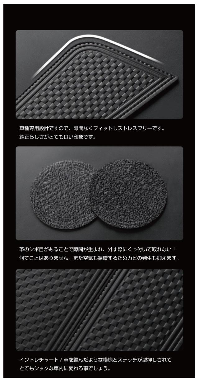 (1)ドアドリンクホルダー(運転席,助手席 各1枚) (2)インパネ小物入れ用(ナビ下のトレイ)×1 (3)ミニセンターコンソール用(シフト下)×1 ※シートヒーター無し車用 (4)フロントコンソールトレイ用×1 (5)フロントカップホルダー用(脱着式)×2 (6)フロントコンソールトレイ用(脱着式)×1 |