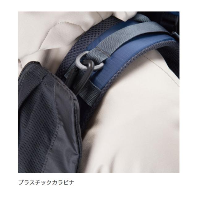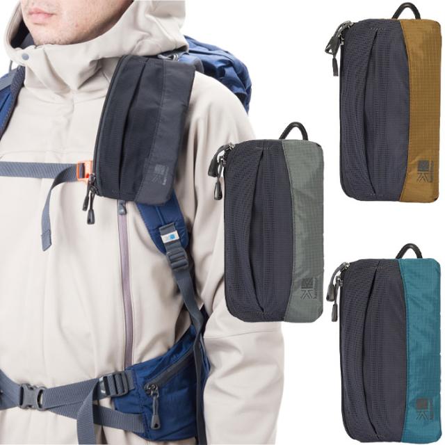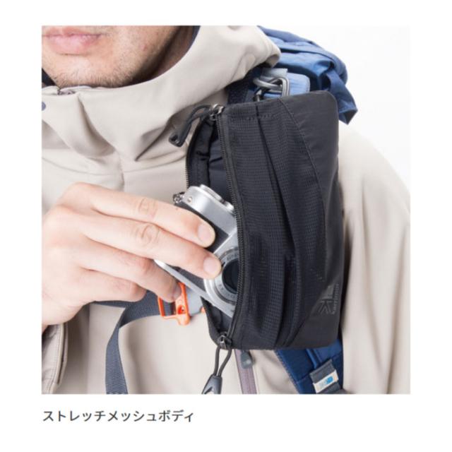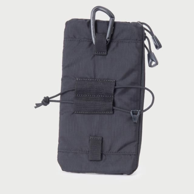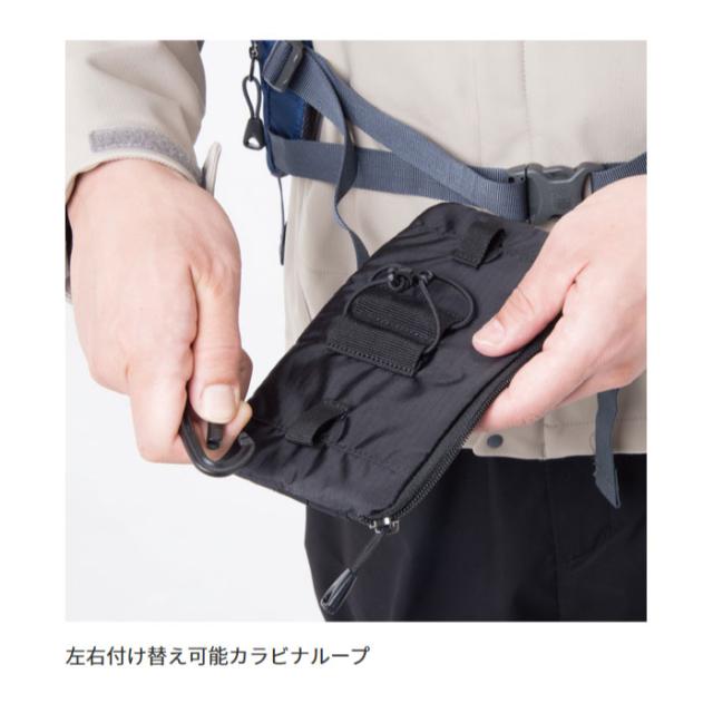 プラスチックカラビナとイラスチックコードを使用し、ショルダーハーネスに固定できる小型のポーチ。スマートフォンをはじめ、ガジェットの携行に便利。