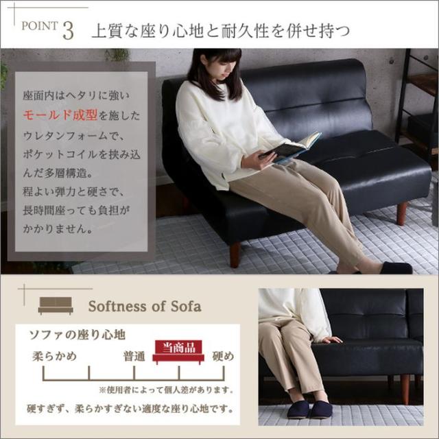 高級感のあるPVCレザーがワンランク上のお部屋を演出。カラーバリエーションは、ブラック(JAN:4535306180850/品番:SH-07-SNG-2--BK)、アイボリー(JAN:4535306180836/品番:SH-07-SNG-2--IV)、ブラウン(JAN:4535306180843/品番:SH-07-SNG-2--BR)です。日本製の確かな品質はひとつずつ丁寧に作られた熟練の手によるもの。座面にはモールド成型とポケットコイルの多層構造で、体にフィットする上質な座り心地と耐久性を実現。ゆったり座れるワイド設計と取替え自由な2種類の脚で、リビングライフの多様性に応える充実のソファです。