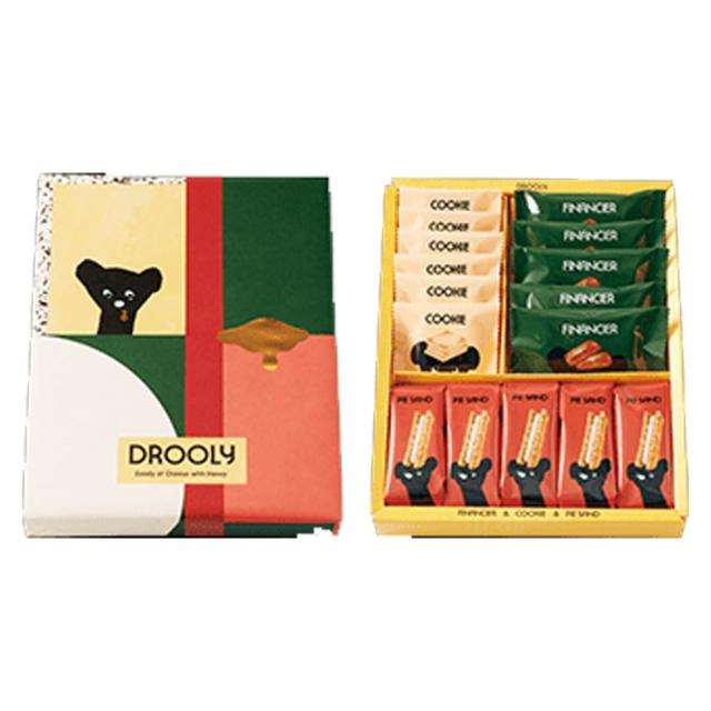 たくさんのチーズと蜂蜜の香りと味のマリアージュの、ちょっと大人でやさしいハーモニーを楽しめるDROOLY自慢のアソートボックスですフィナンシェ5個・クッキー6枚・パイサンド5個※代理購入となります。ご了承ください。