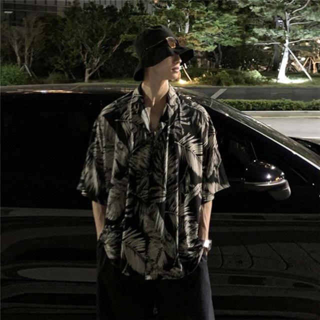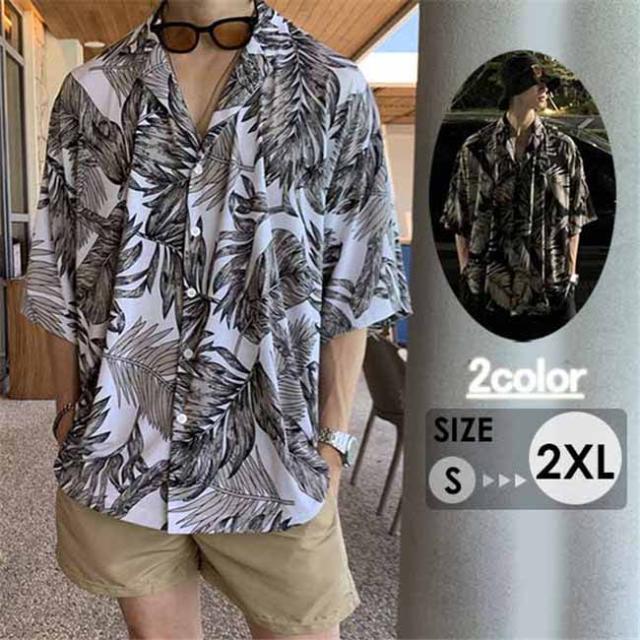 アロハシャツ 浮世絵風 メンズ 半袖ビーチシャツ リーフ柄 グリーン ブラック S M L XL 2XL 復古する リゾートトップス dd195c0c0c9
