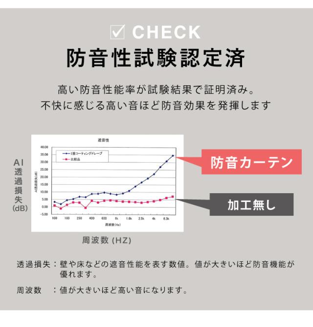 3重のアクリルコーティングを施した生地を2枚合わせ(2層)にした防音仕様のカーテンです。