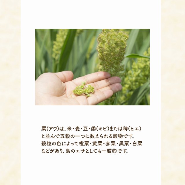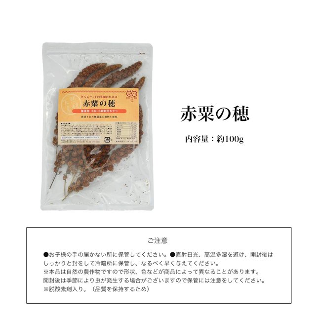 | 説明 | 天然無添加の穂付き赤粟です。 ヘルシーで喰い付きの良い赤粟を穂付きで。 喰い付きが良く、健康にも良いおやつです。 対象:中型インコ セキセイインコ ブンチョウ ジュウシマツ カナリア ハムスター リス等 |