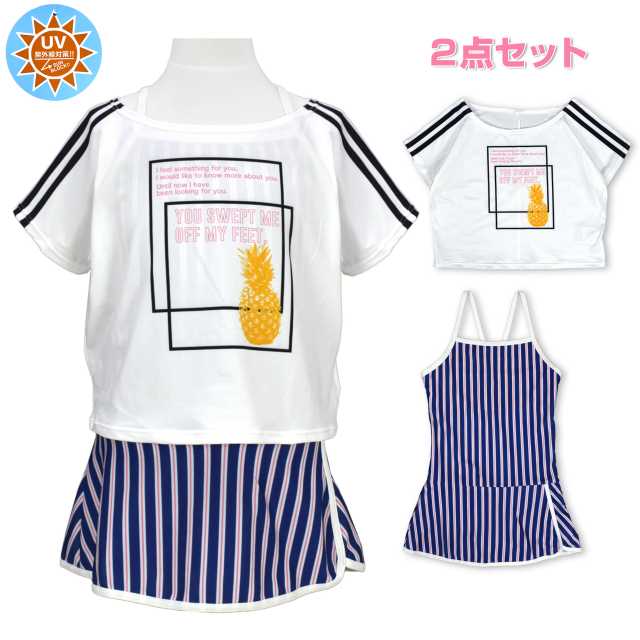 水着 ワンピース キッズ ジュニア 女の子 カバーアップ UVカット 2点セットネイビー