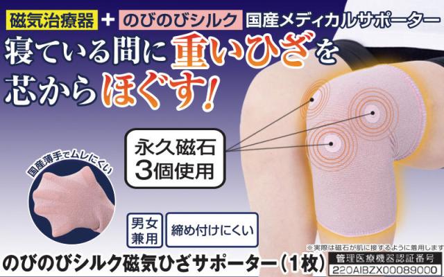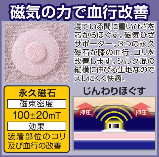 磁気治療器+のびのびシルク国産メディカルサポーター。寝ている間に重い膝を芯からほぐす磁気ひざサポーター。3つの永久磁石が膝の血行、コリを改善します。縦横に伸びるシルク混生地なので、ズレにくく快適です。