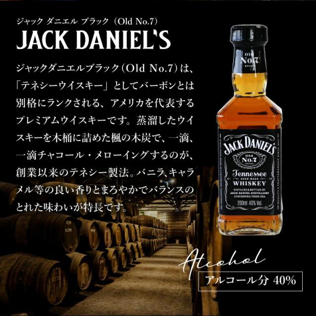 | ジャックダニエル | ■原産国 : アメリカ ■種類 : ウイスキー ■アルコール分 : 40% ■容量 : 200ml |