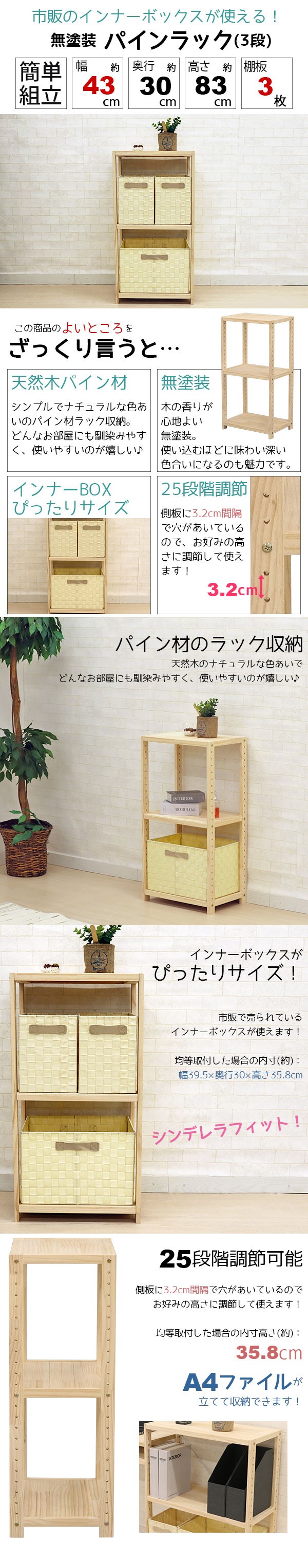 ウッドラック 3段 A4ファイル収納 A4収納 おしゃれ 幅42.5cm 奥行30cm 高さ83cm 収納 オープンラック B5ファイル収納 B5収納 木製 天然木 無塗装 パインラック パイン材 シンプル かわいい フリーラック インナーボックス ナチュラル ラック収納 シンデレラフィットHZPR-3D42