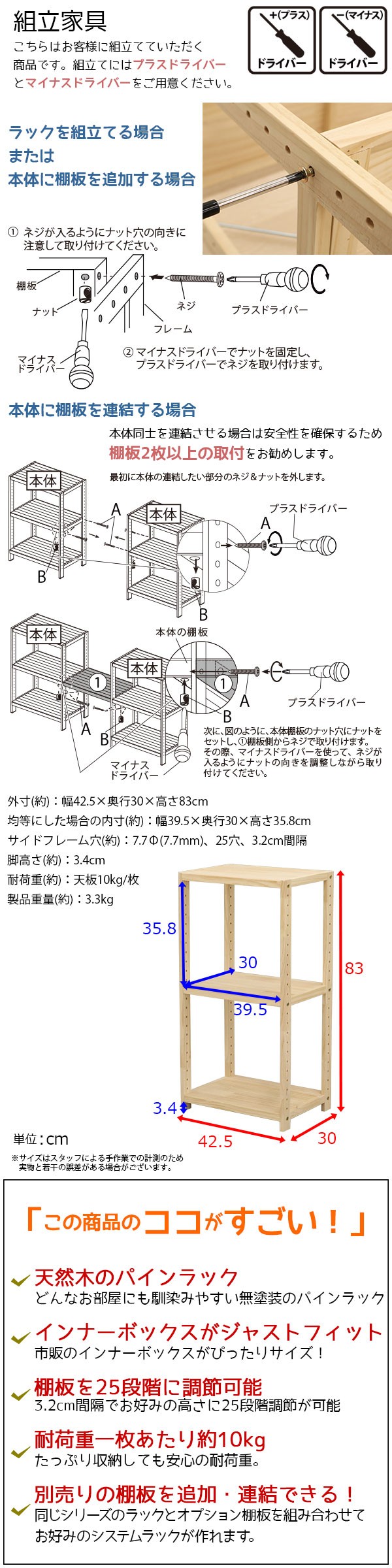こちらはお客様に組立てていただく商品です。組立てにはプラスドライバーとマイナスドライバーをご用意ください。