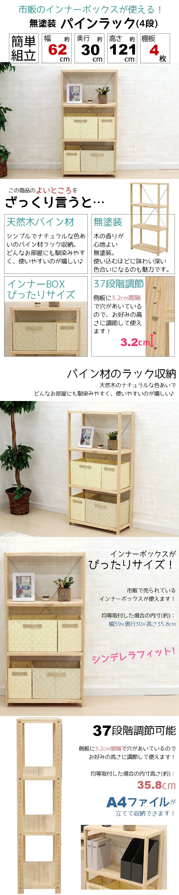 ウッドラック 4段 A4ファイル収納 A4収納 おしゃれ 幅62cm 奥行30cm 高さ121.4cm 収納 オープンラック B5ファイル収納 B5収納 木製 天然木 無塗装 パインラック パイン材 シンプル かわいい フリーラック インナーボックス ナチュラル ラック収納 HZPR-4D62