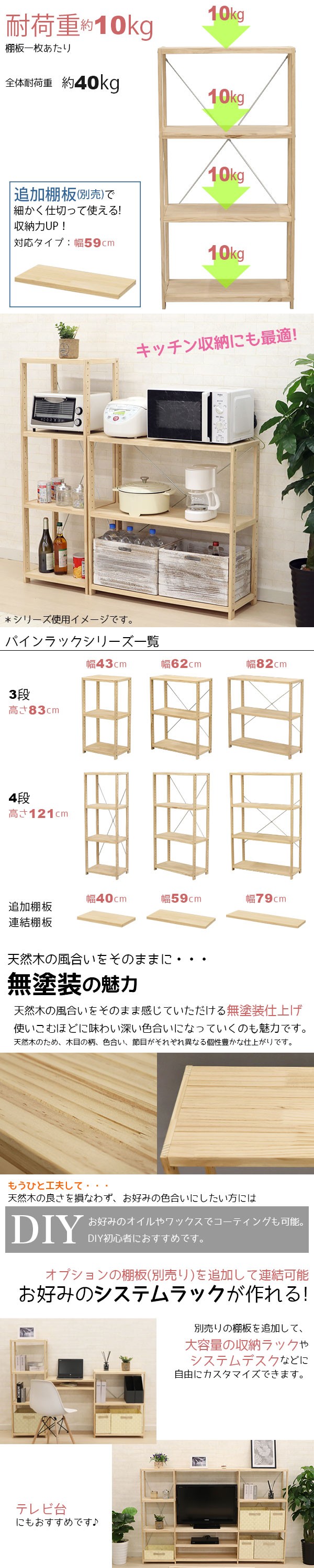 無塗装パインラック4段の説明