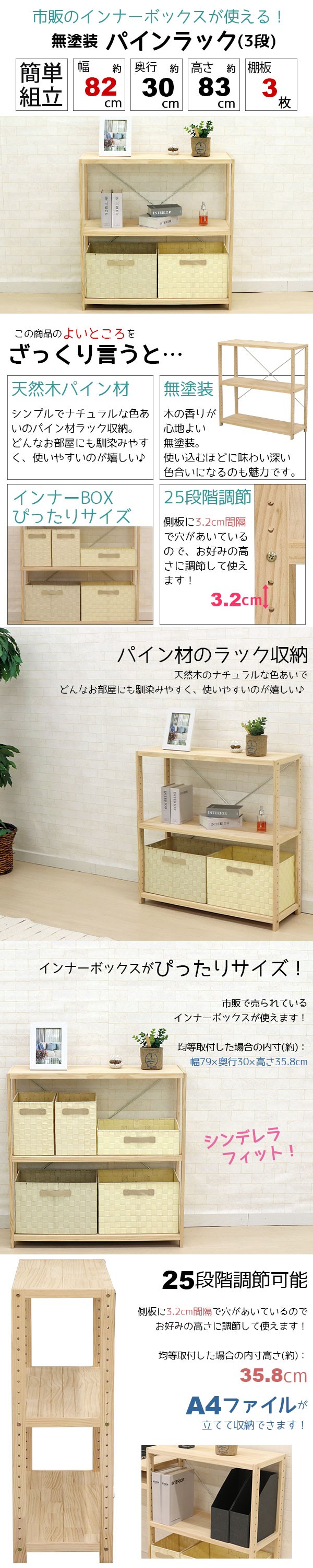 商品名:ウッドラック 3段 A4ファイル収納 A4収納 おしゃれ 幅82cm 奥行30cm 高さ83cm 収納 オープンラック B5ファイル収納 B5収納 木製 天然木 無塗装 パインラック パイン材 シンプル かわいい フリーラック インナーボックス ナチュラル ラック収納 シンデレラフィット