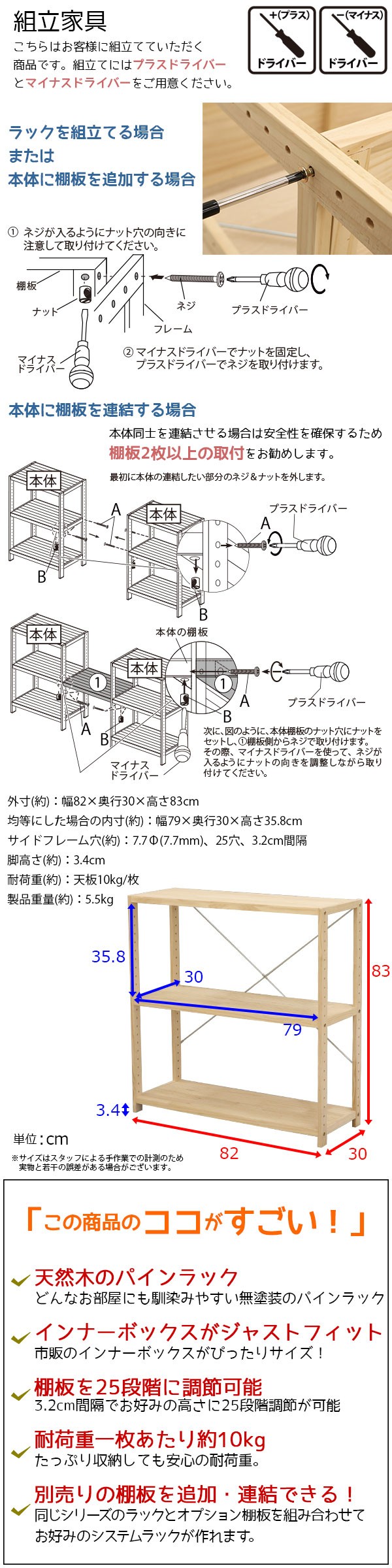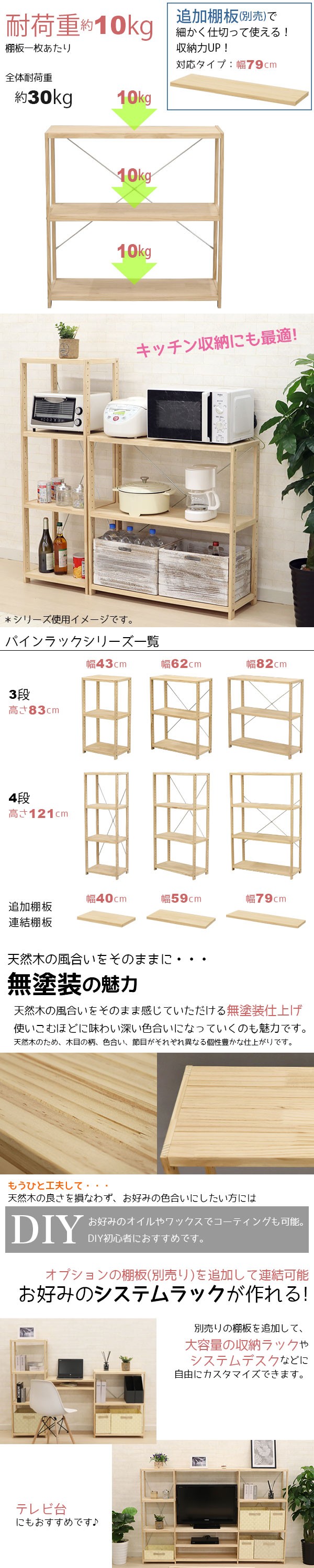 無塗装パインラック3段の説明