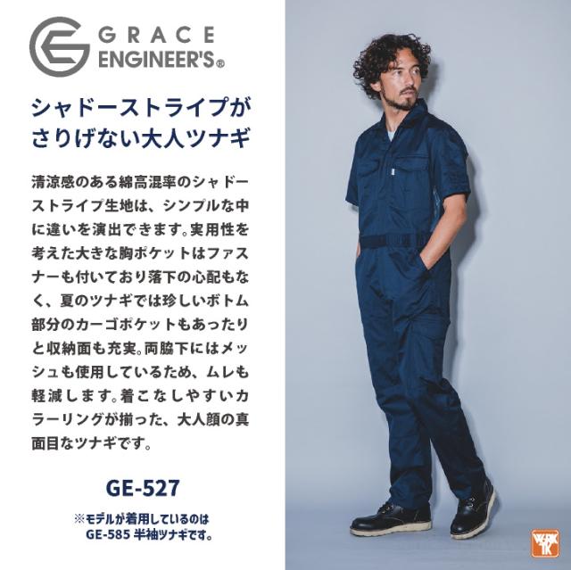 GRACE ENGINEER'S GE-527 シャドーストライプ・サマー長袖ツナギ 清涼感のある綿高混率の生地で、シンプルな中に違いを演出。 シャドーストライプがさりげない大人ツナギ。