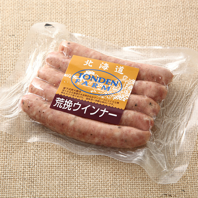 豚肉を荒挽きにしてワイルドな食感に仕上げてあります。数種類のトンデンファームオリジナルスパイスを利かせて羊腸詰めにした本格派荒挽きウインナ−。
