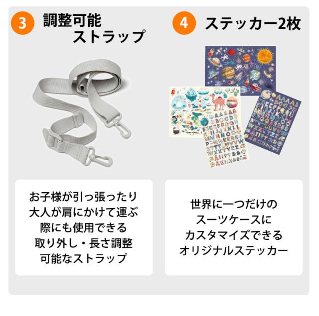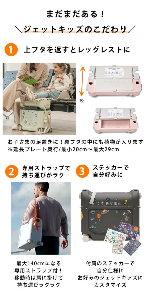【特徴】ジェットキッズはご旅行など移動の際、荷物を入れたジェットキッズの上にお子さまを乗せたり、ストラップで引っ張って運ぶことができます。