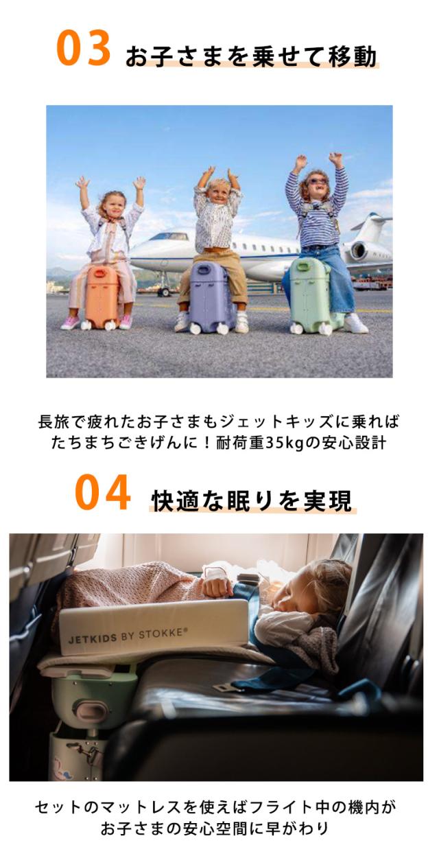また、簡単な組み立てで付属のマットレスを機内や列車の座席に設置すれば、ジェットキッズがお子さま用の簡易ベッドに早変わり!