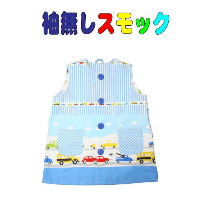 袖なしスモック スモック ブルー×自動車柄 キッズスモック 子供用スモック お絵かき 保育園 幼稚園 お稽古 入園 入学 ロリポップ