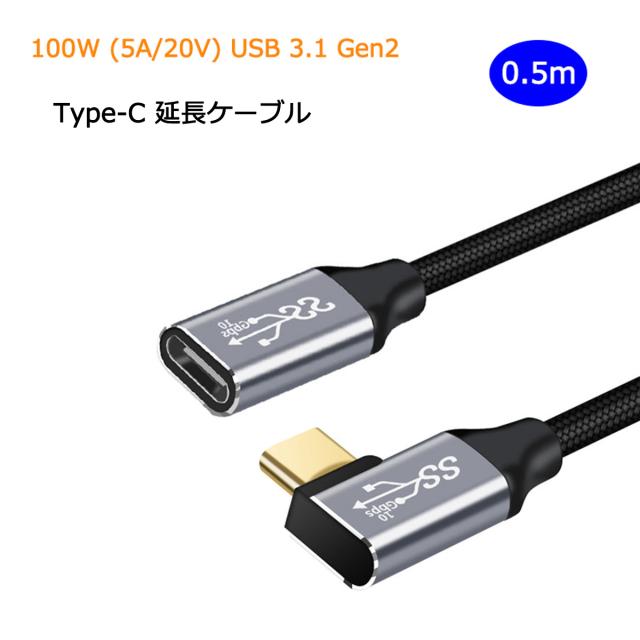 L字 0.5m USB Type C 延長ケーブル 100W 5A PD対応 急速充電 USB 3.1 Gen2 10Gbps データ転送 4K/60Hz 映像出力 タイプC 充電ケーブル 延長コード ナイロン編み