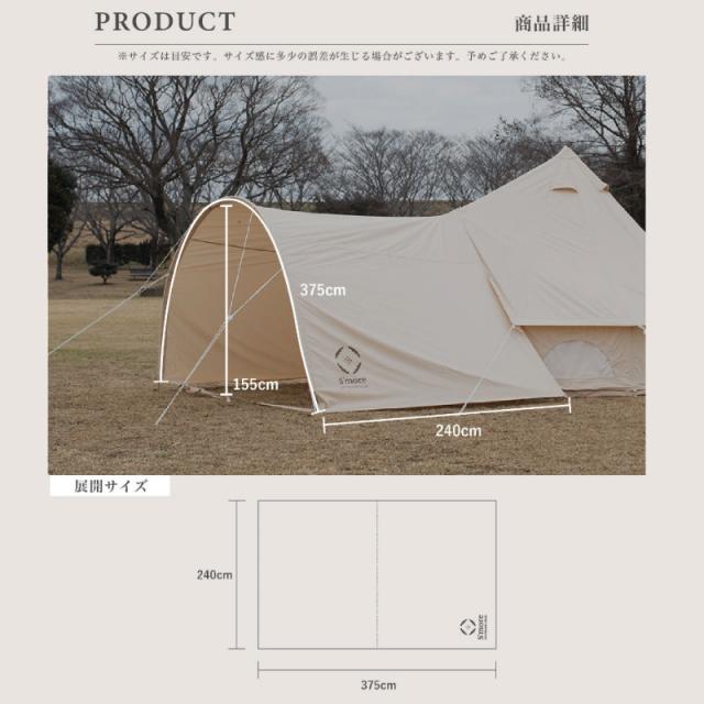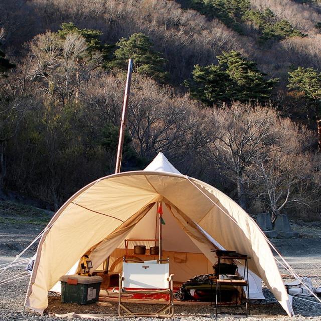 ベル型テントの前室として重宝するこちらのタープは、アーチ状の入り口が最大の特徴で、ベル型テントのデザインとの相性も抜群です。