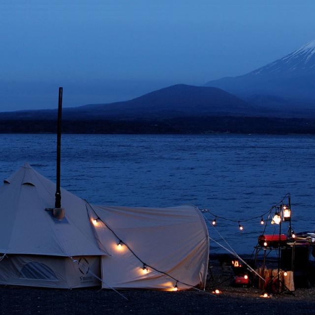 キャンプサイトでも目を引く珍しい形状のタープは、テンションをさらにあげてくれます。