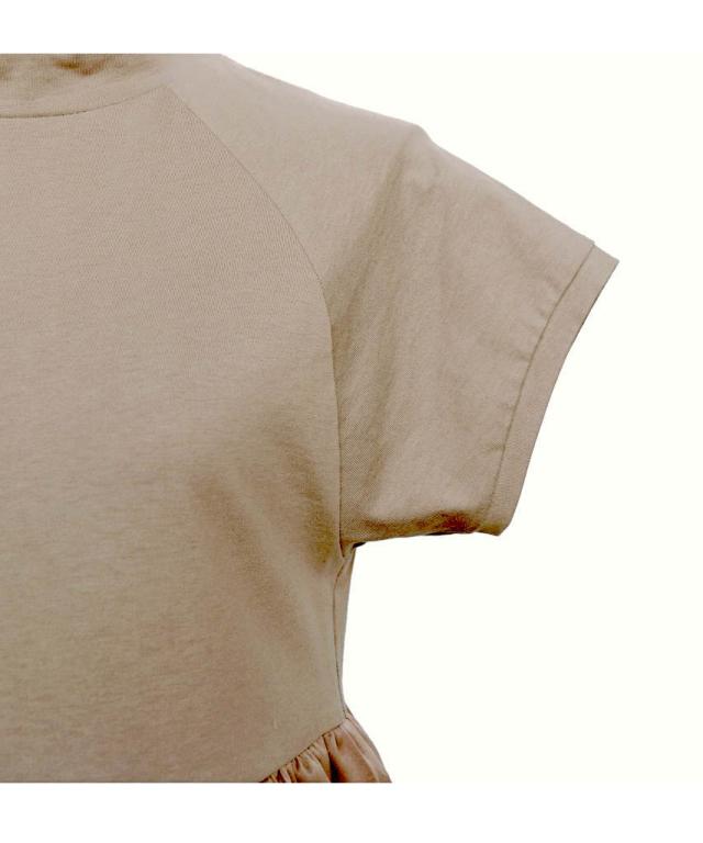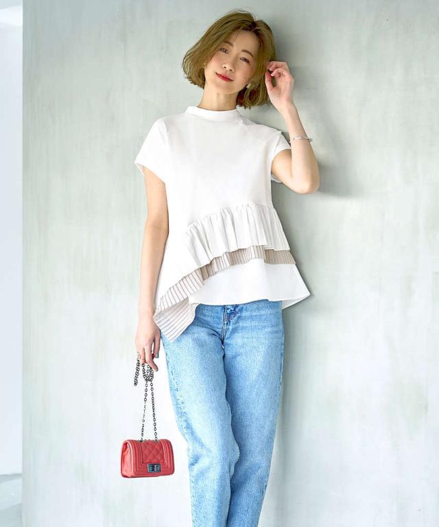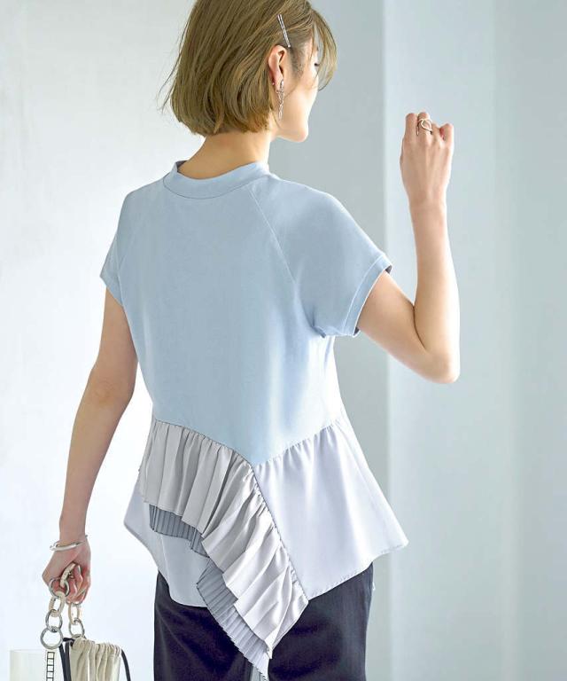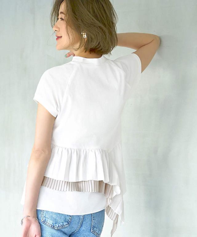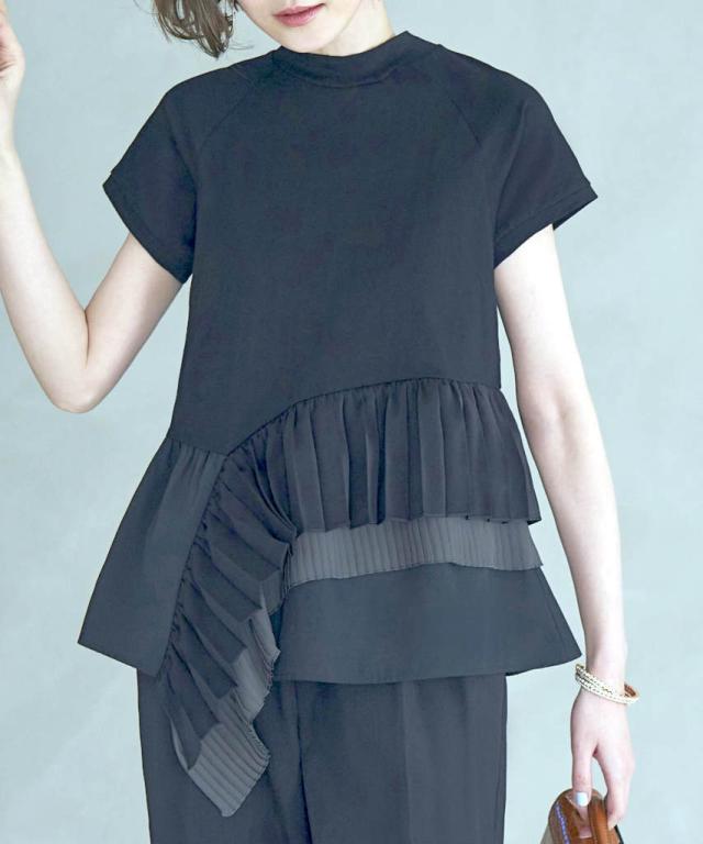 【S〜3L】異素材ダブルプリーツペプラムカットソー