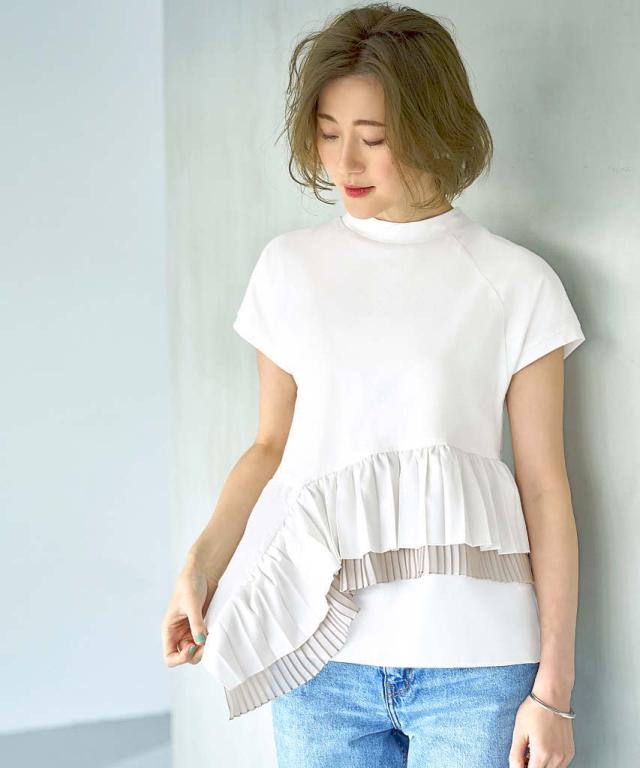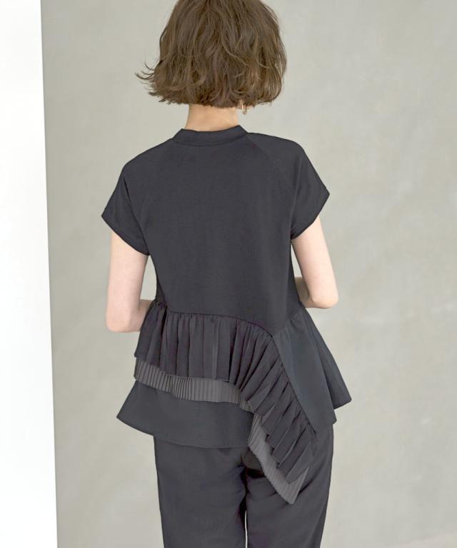 異素材で幅の違うプリーツをアシンメトリーにあしらったデザインカットソー。
