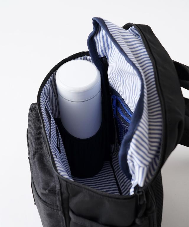 表面にファスナー式やサイドにはオープンポケットなど用途に合わせて収納できる