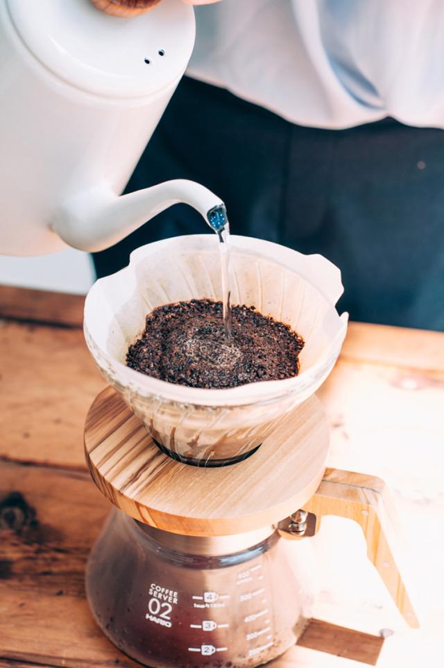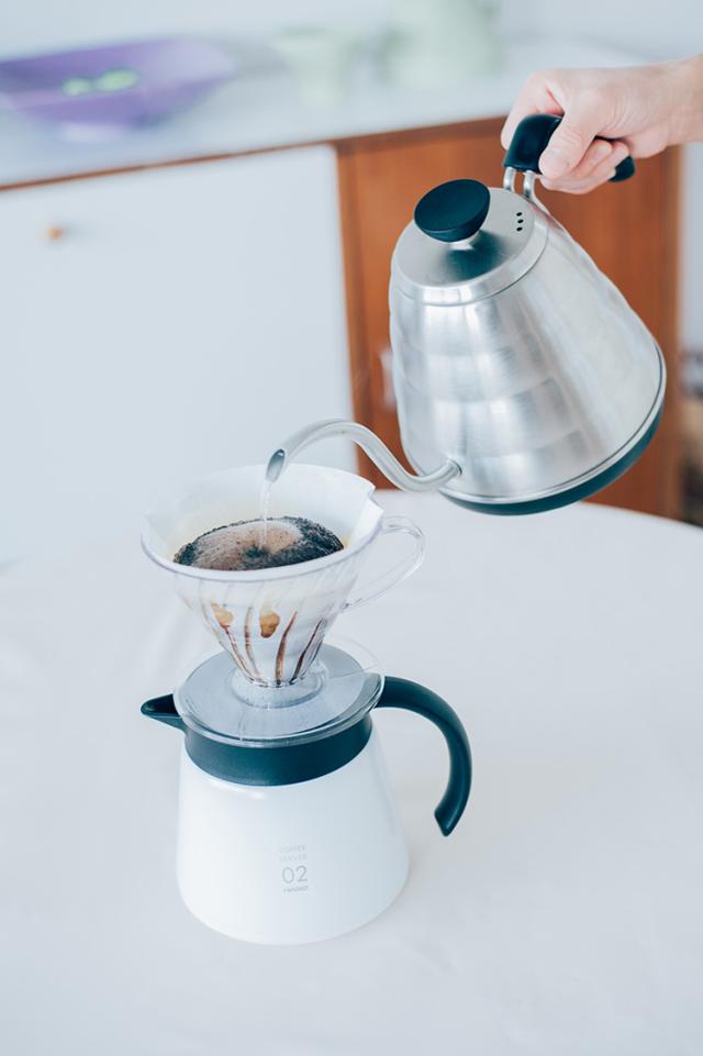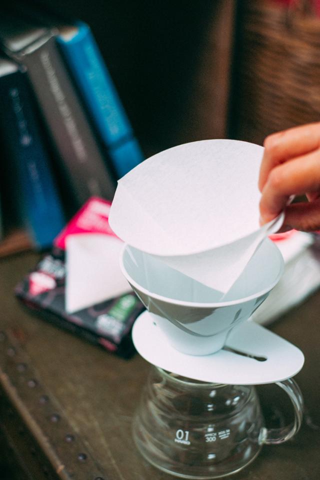 ●V型円すい形のペーパーフィルターは、コーヒー粉の層が深く、コーヒー粉に注いだお湯が円すいの頂点に向かって流れるので豆の旨味をしっかり抽出できます。