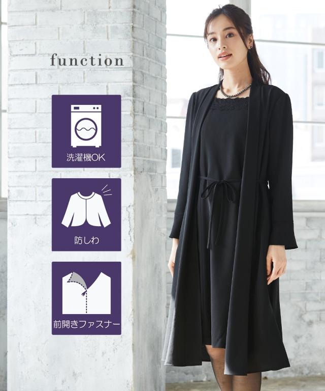 【喪服・礼服】洗える防しわ軽い羽織りアンサンブル風前開きワンピース<大きいサイズ有>
