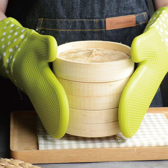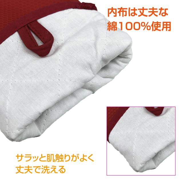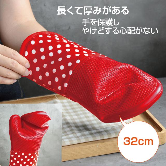 長くて厚みがあるので手を保護し、やけどする心配がない。300℃耐熱仕様です。