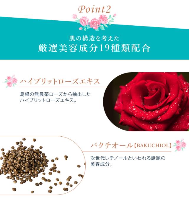 リッチフラワーモイスチャーエッセンスは 島根の無農薬ローズから抽出したハイブリットローズエキスを含む、19種類の美容成分を贅沢に配合した「進化型化粧水」