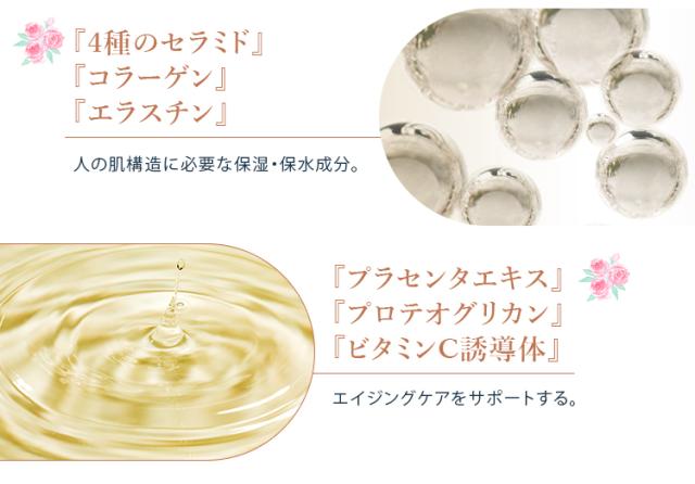 人の肌構造に必要な保湿・保水成分『4種のセラミド』、『コラーゲン』、『エラスチン』、エイジングケアをサポートする『プラセンタエキス』、『プロテオグリカン』、『ビタミンC誘導体』、さらに次世代レチノールとも言われる『バクチオール』を配合