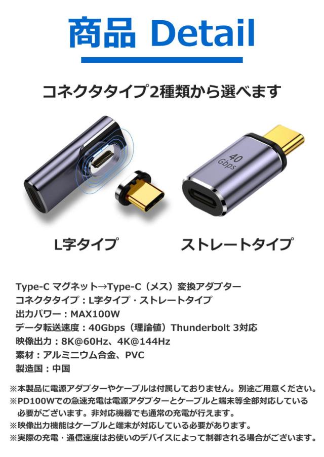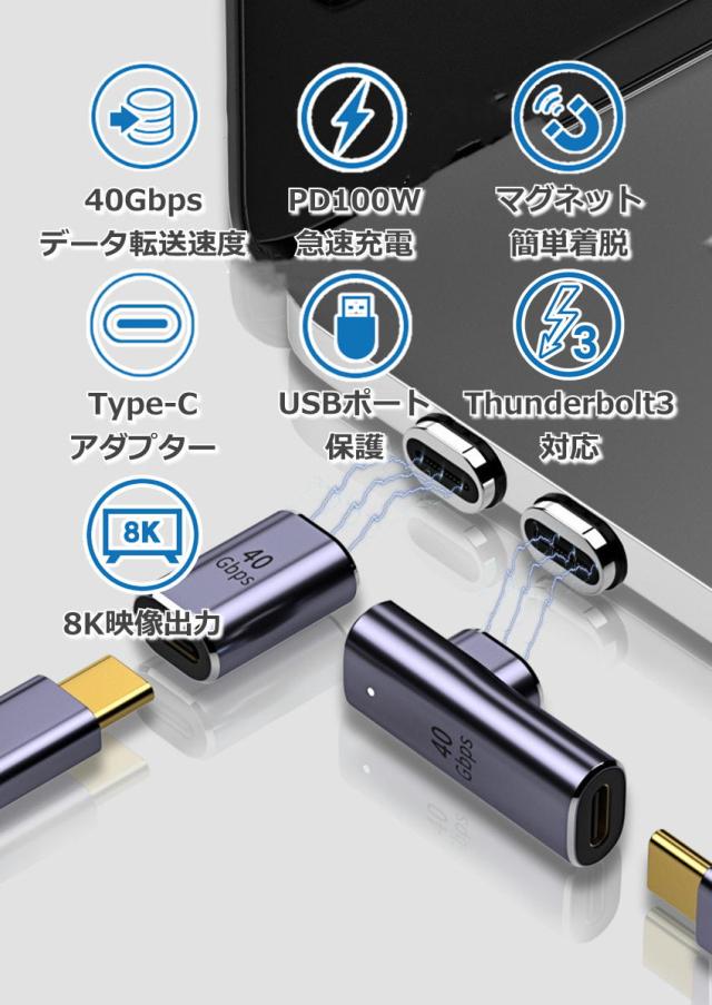 USB4.0 Type-C 変換 アダプター PD100W 充電 40Gbps 転送 8K映像出力 タイプC マグネット L字 PD対応 データ転送 変換アダプター 100W PD コネクタ USB アダプタ 急速充電 データ転送 変換 USB-C Power Delivery スマホ タブレット MacBook パソコン【メール便 送料無料】