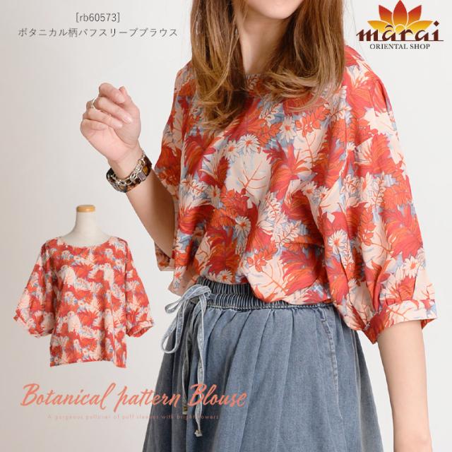 パフスリーブ ブラウス レディース 半袖 五分袖 柄シャツ シャツ トロピカルな雰囲気の総ボタニカル柄。パフスリーブブラウス rb60573 トップス ボートネック 花柄 柄物 総柄 体型カバー 二の腕隠し おしゃれ きれいめ とろみ 涼しい 春 春服 夏 夏服 M L レッド オレンジ