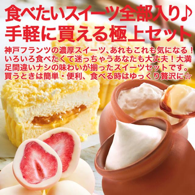 神戸フランツのふわとろスイーツが1度に楽しめる豪華スイーツセット!モンドセレクション最高金賞10年連続受賞の神戸魔法の壷プリン®と、サワークリームとはちみつでふわふわトロ〜り食感の神戸半熟フロマージュ、さらに10万個以上完売の甘酸っぱい苺とミルクのフルーツショコラ、神戸苺トリュフ®♪どのスイーツから食べようか、わくわく楽しいスイーツセットは、贈り物にもピッタリ☆