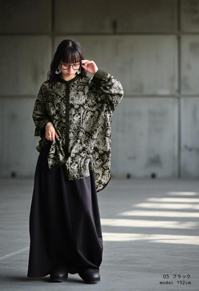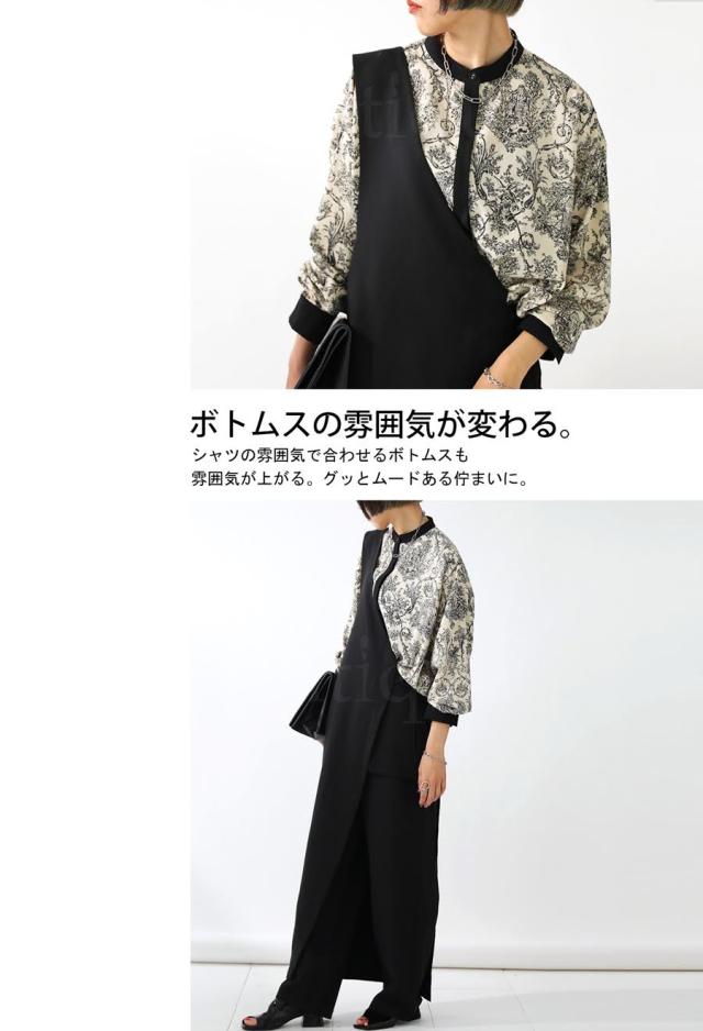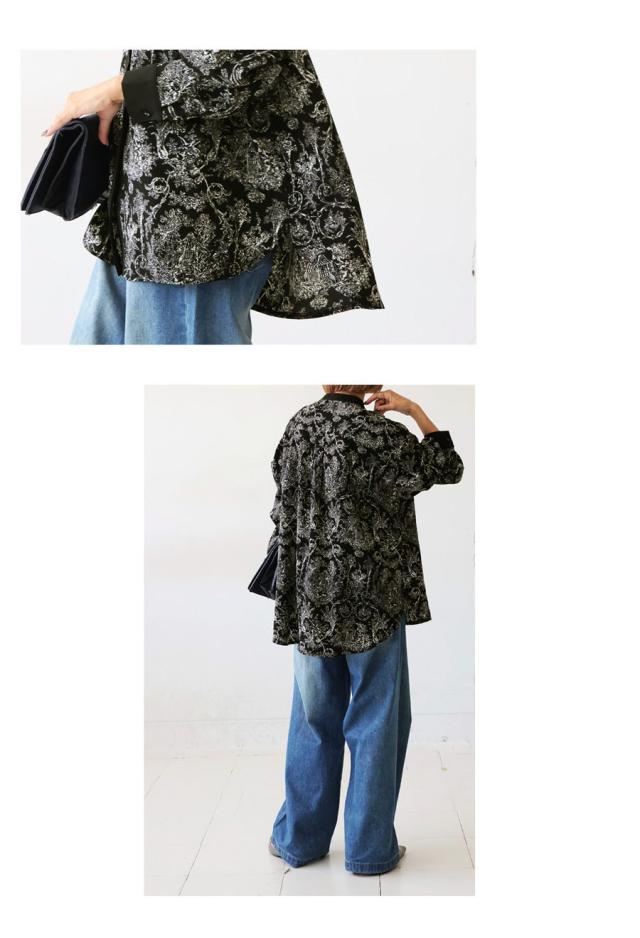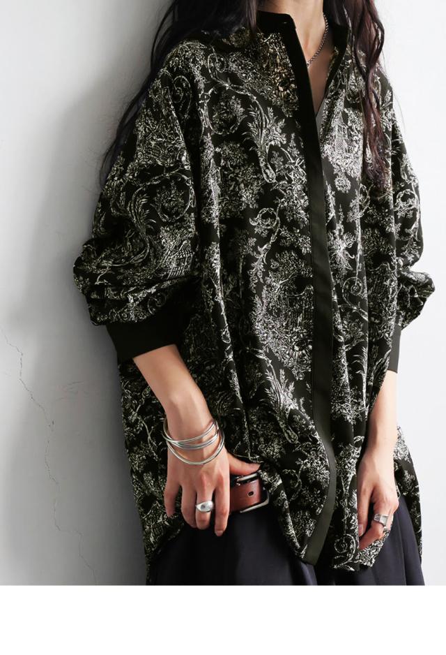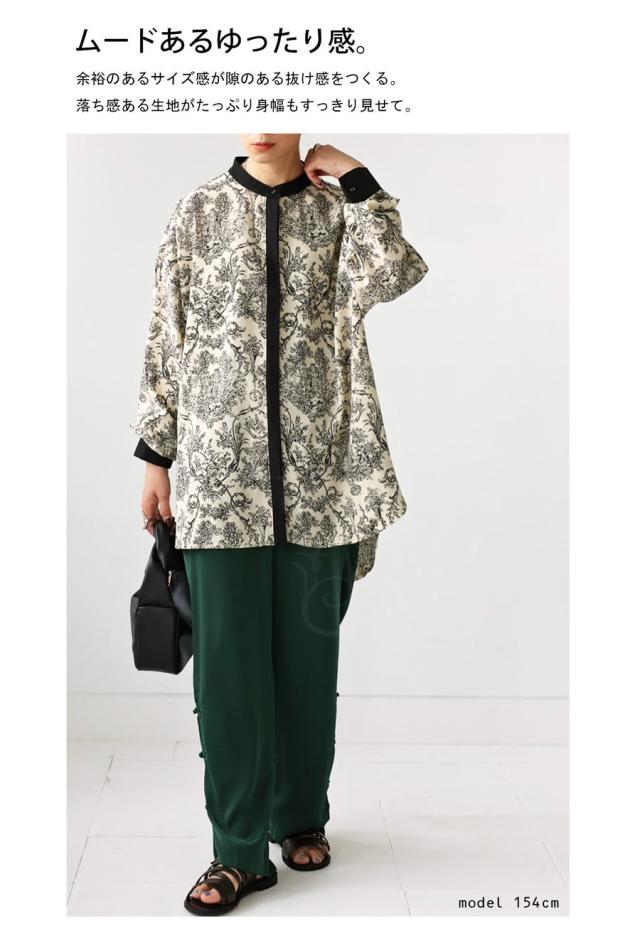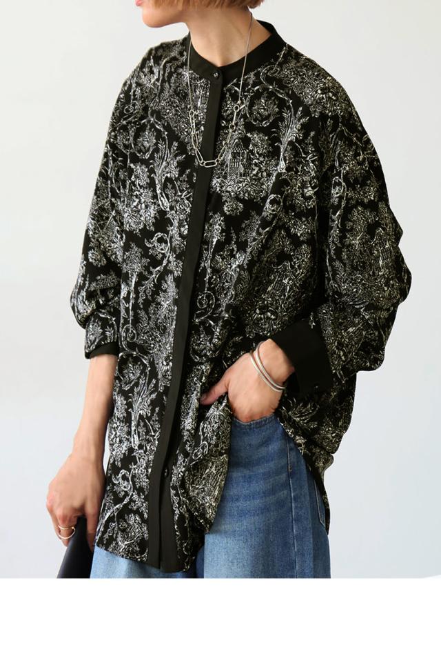 po-00144 ブラウス トップス 柄シャツ 柄 アート柄 風景 絵画 モノトーン 上品 きれいめ ゆったり 長め丈 スタンドカラー 裾ラウンド 前後差 オーバーサイズ 大きいサイズ とろみ