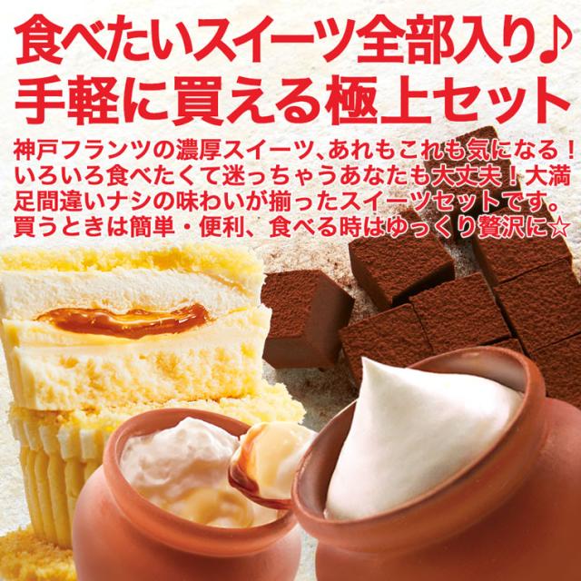 神戸フランツのふわとろスイーツが1度に楽しめる豪華スイーツセット!モンドセレクション最高金賞10年連続受賞の神戸魔法の壷プリン®と、サワークリームとはちみつでふわふわトロ〜り食感の神戸半熟フロマージュ、さらにカカオのほろ苦さも楽しめるとろける口どけの、神戸魔法の生チョコレート®・プレーン♪どのスイーツから食べようか、わくわく楽しいスイーツセットは、贈り物にもピッタリ☆