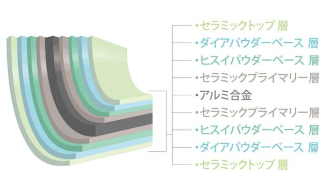 Wストーンセラミックコーティングは、ヒスイ・ダイヤ・セラミックのトリプルコーティングでキズに強いです。フライパンの素地(アルミ)に、それぞれのコーティングを内面と外面に4層ずつ施した8層コーティング仕様です。最高硬度9Hテストにも合格し、トップレベルのセラミックコーティングで耐熱性にも優れています。